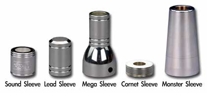 MEGASLEEVE (center) is designed for players that want to add that Heavy-weight sound to their present mouthpiece. With this mounted on your mouthpiece you will be able to play with incredible volume without having the sound “break up.” Comes in sizes to fit Ba